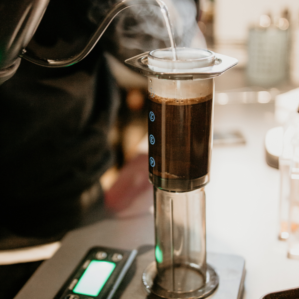 15 g coffee, 250 g water, 94°C. 2:30–3:00 total time. Medium-fine grind.